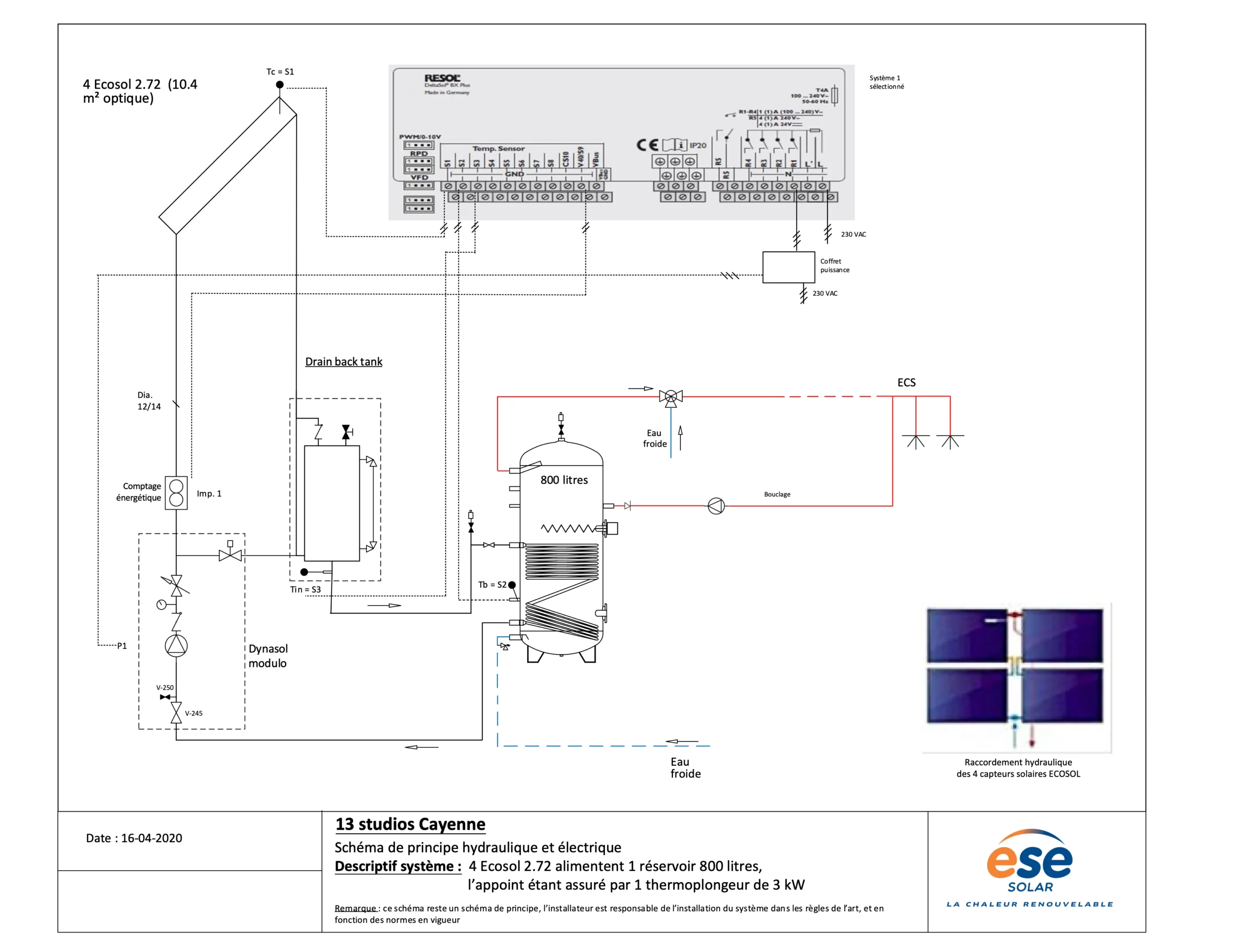 L’installation solaire thermique destinée aux 13 studios de Cayenne repose sur une conception performante et parfaitement adaptée aux conditions tropicales. Le schéma de principe montre l’utilisation de quatre capteurs solaires ECOSOL 2.72, offrant une surface optique totale de 10,4 m². Cette configuration permet de capter efficacement l’énergie solaire afin d’alimenter la production d’eau chaude sanitaire (ECS) pour l’ensemble de la résidence.