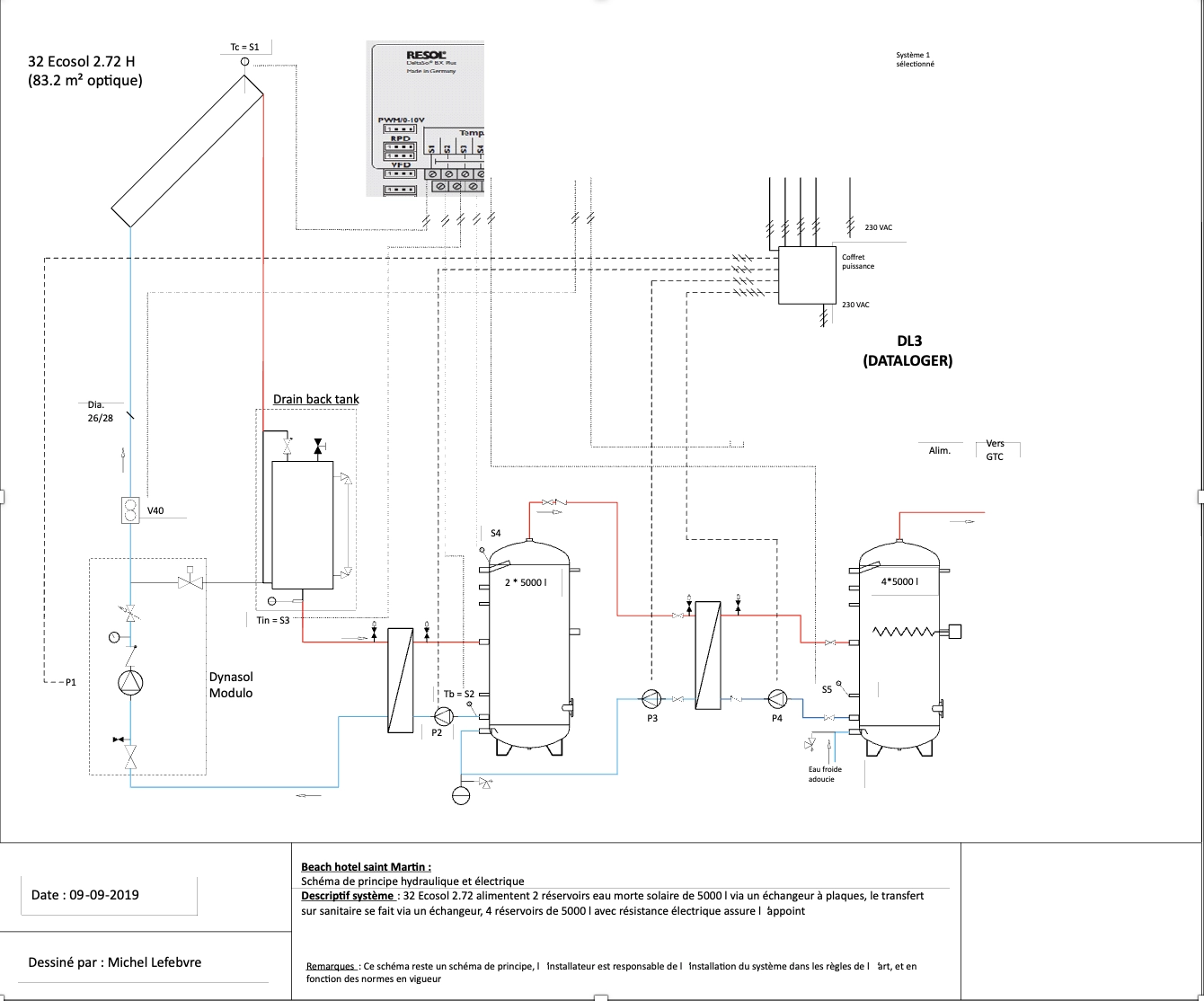 Le schéma intègre un DL3 (Datalogger), permettant un suivi en temps réel de la production solaire, des températures, des débits et des performances globales du système. Les données peuvent être transmises vers la GTC (gestion technique centralisée), un atout essentiel pour un hôtel nécessitant une supervision continue.